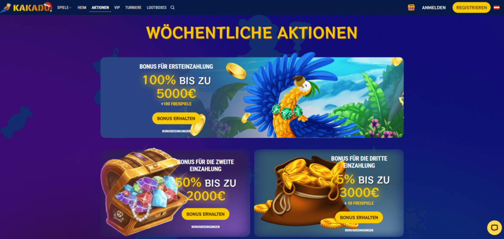 Es ist dennoch zu beachten, dass das Kakadu Casino gelegentlich unterschiedliche tägliche und wöchentliche Sonderaktionen durchführt. Falls Sie ein begeisterter Bonusjäger sind, wäre es empfehlenswert, sich für den wöchentlichen Newsletter zu registrieren. Auf diese Weise bleiben Sie stets über die neuesten Entwicklungen und Geschehnisse auf der Webseite von Kakadu Casino informiert. So können Sie sicherstellen, dass Ihnen keine der aufregenden Möglichkeiten entgeht.