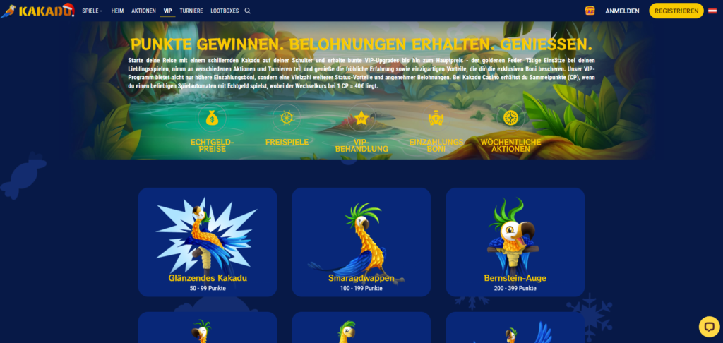 Das VIP Programm des Kakadu Casino beinhaltet darüber hinaus wesentliche Match-Boni und eine Vielzahl von zusätzlichen großartigen Statusvorteilen und Privilegien. Bei jedem Echtgeld-Spielautomaten, den Sie im Kakadu Casino spielen, sammeln Sie Gratispunkte. Konkret bekommen Sie 1 CP für jeden gesetzten Betrag von 40€.